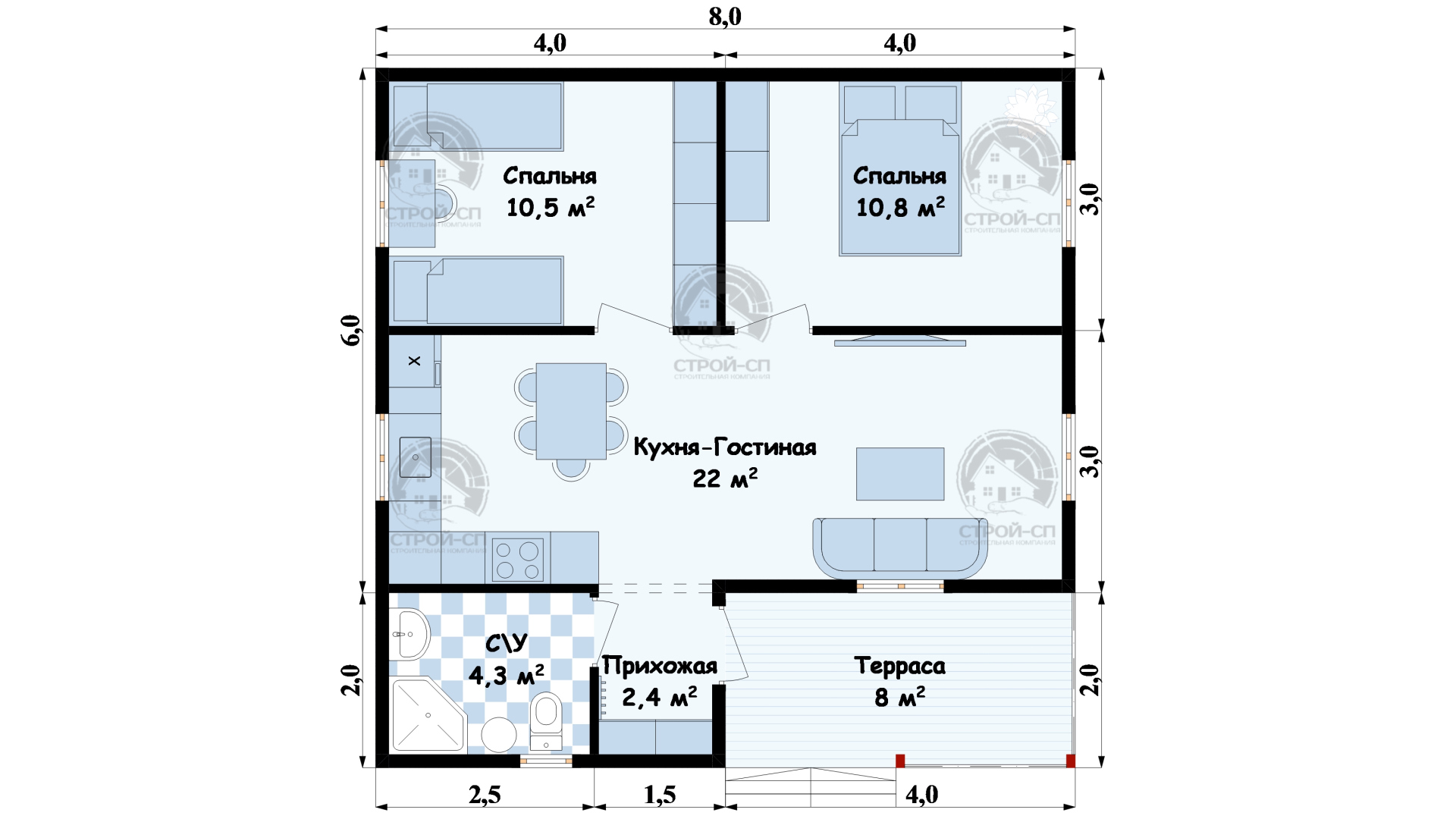 Дом в один этаж размером 8х8 и общей площадью 64 квадратных метра.